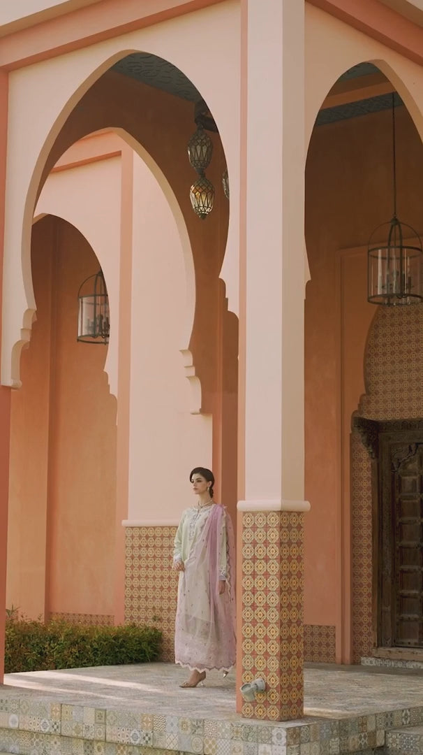 A heavenly work of art, radiating elegance, grace, and a hint of celestial charm. This captivating ensemble intertwines dainty pearls, shimmering crystals, Swarovski elements, and elaborate Dabka embroidery, enveloped in ethereal lace and embellished with enchanting scalloped embroidery.
