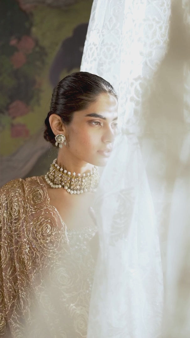 The outfit graces the wearer with a kalidaar silhouette in the soft and enchanting hue of peach. The outfit unfolds like a poetic symphony, where each stitch is a note in the composition of timeless elegance. Adorned with subtle embellishments, Ciel becomes a wearable masterpiece, a silent celebration of grace and femininity.