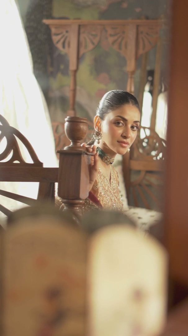 Adorned in opulent silk, this outfit from our selection of showcases is exquisitly handcrafted and embellishments, adorned with fine gold threads that elegantly traverse the fabric, infusing each stitch with a majestic allure.